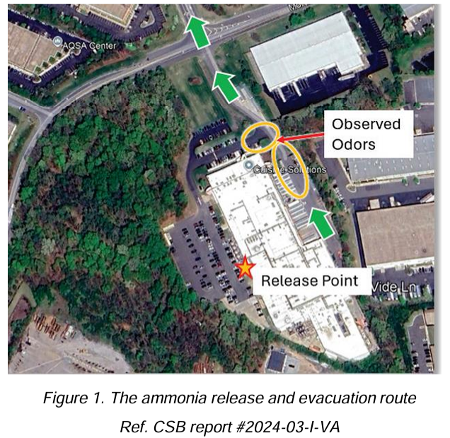 On July 31, 2024, toxic anhydrous ammonia was accidentally released at a food processing facility in Sterling, Virginia. The emergency pressure relief valve discharged approximately 275 pounds (125 Kg) of toxic anhydrous ammonia which formed a cloud. As personnel evacuated from the facility, many inhaled ammonia vapor; four employees were hospitalized.